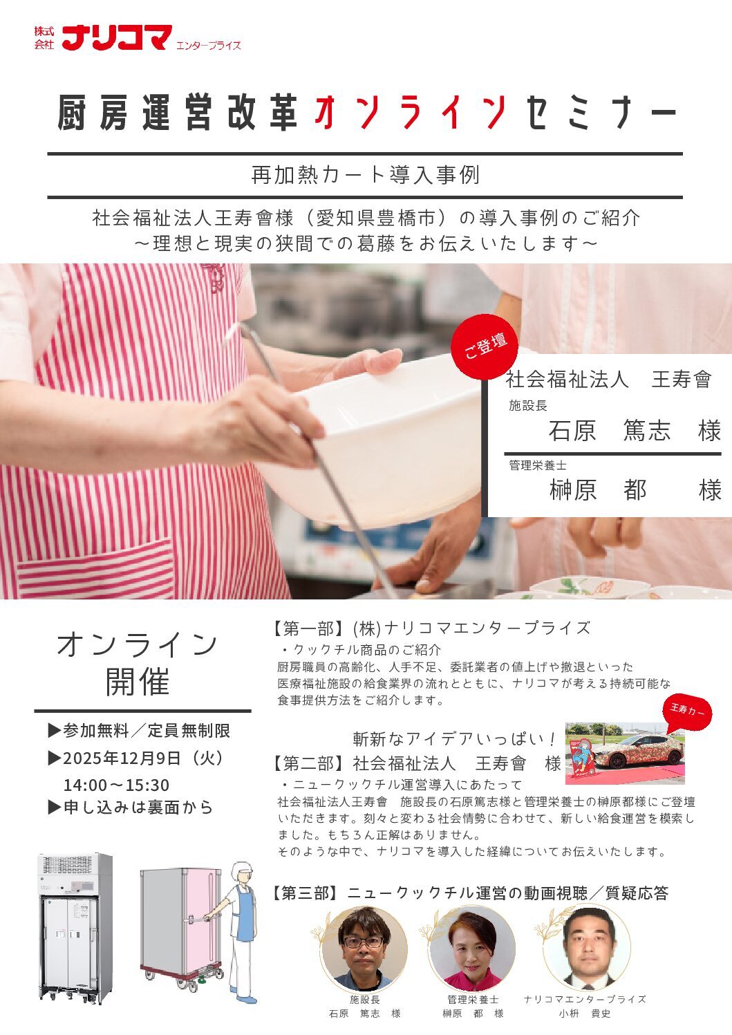 12月9日ナリコマ様主催のオンラインセミナーを富士見王寿園で行いました。富士見王寿園からは施設長石原と管理栄養士榊原が参加して再加熱カート(ニュークックチル)の導入事例についてお話をさせていただきました。たくさんの方が参加してくださり、私たちの取り組みが運営のヒントになれれば幸いです。