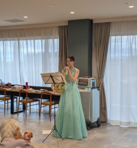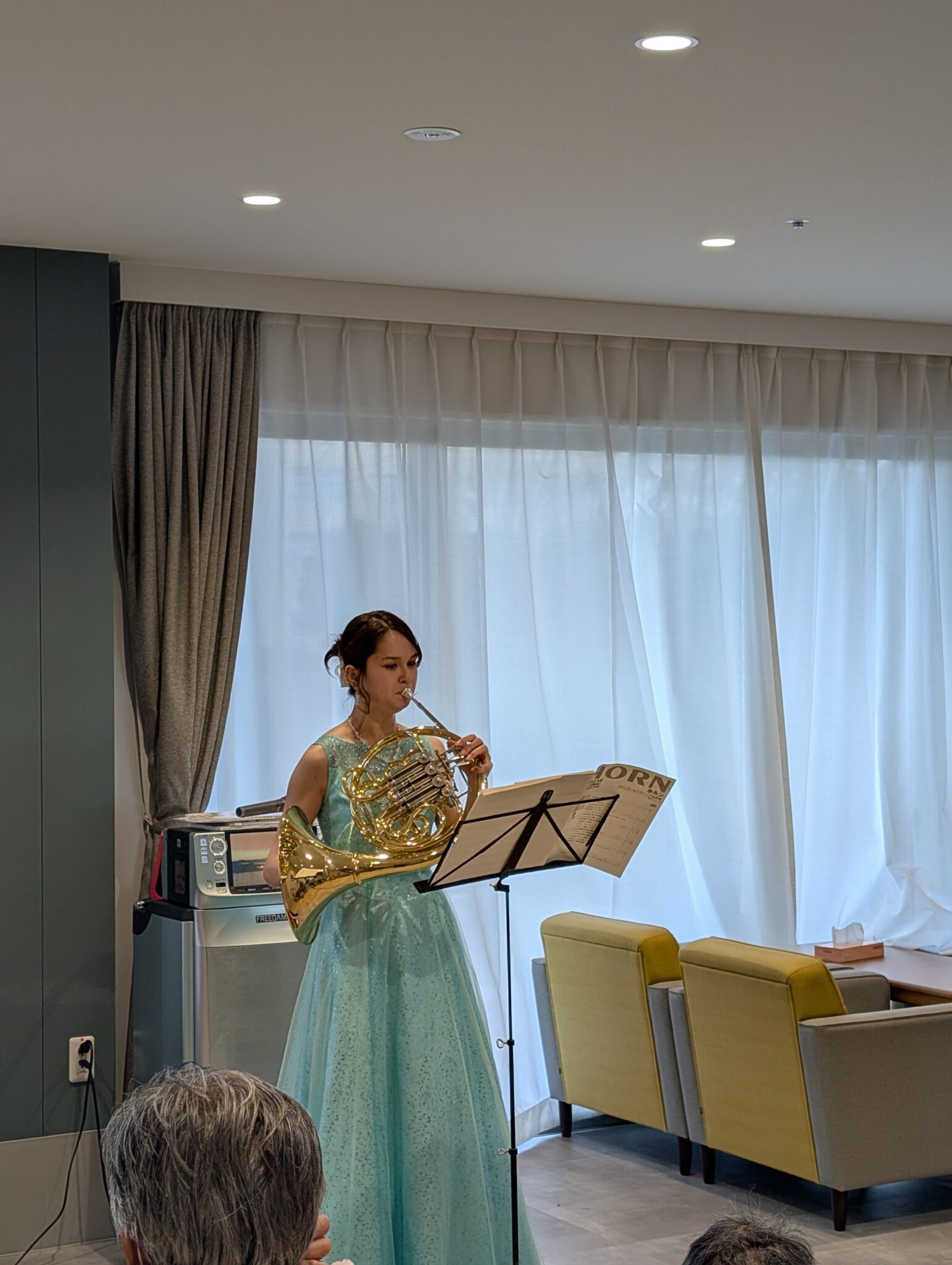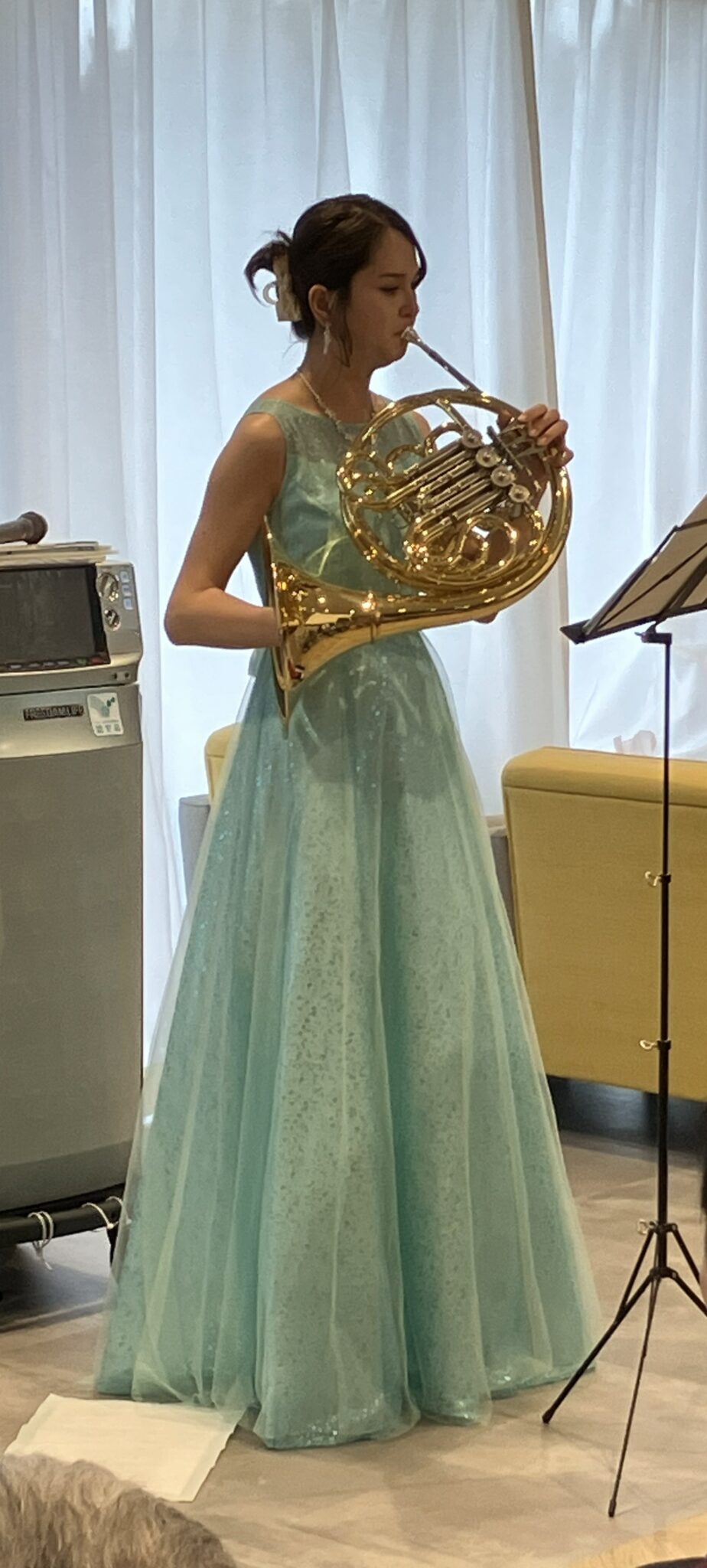 職員の娘様によるホルンの演奏会を開催しました。綺麗な衣装で癒される音色を奏でて下さり、入居者の皆様全員聞き惚れていました。