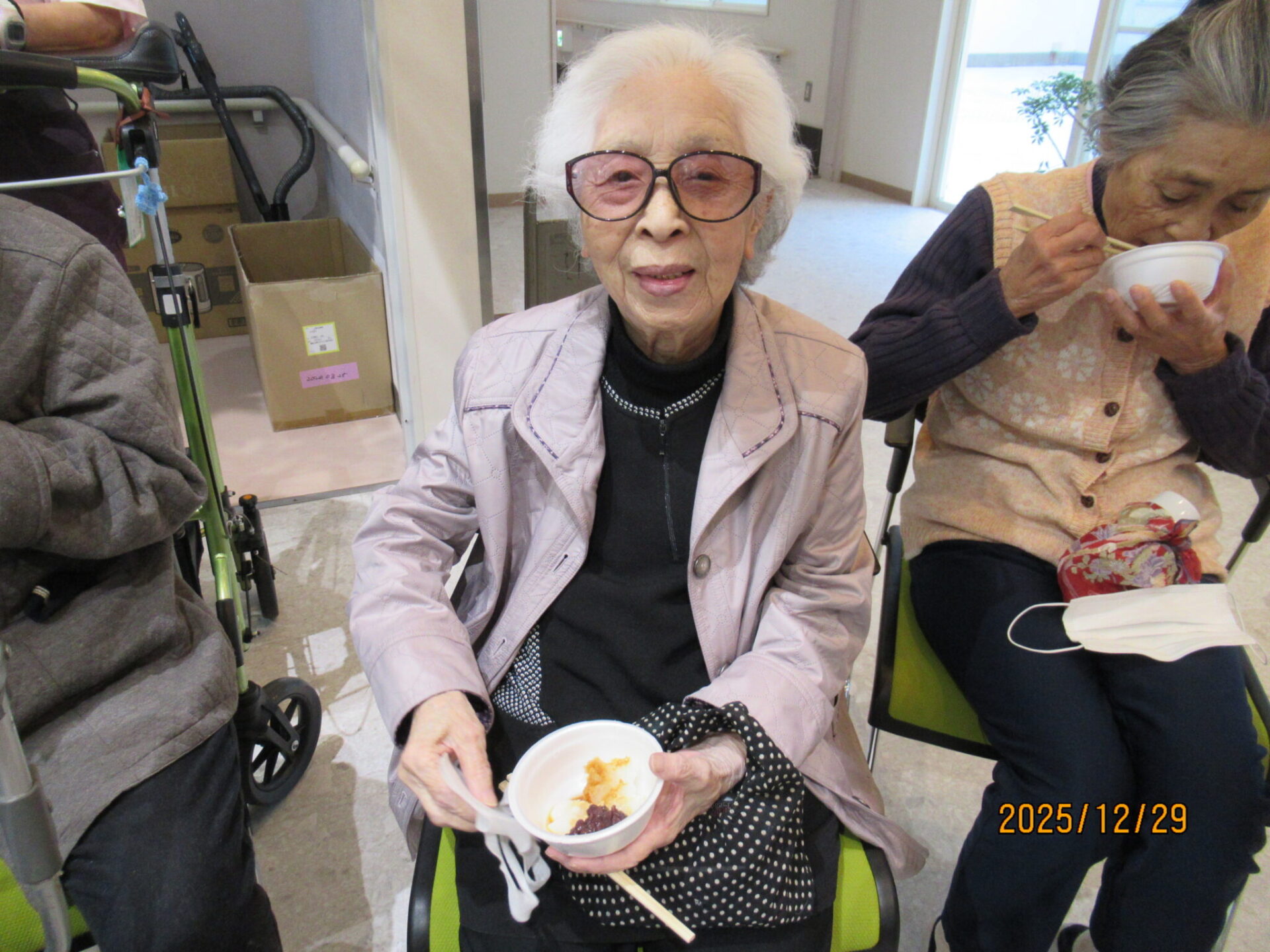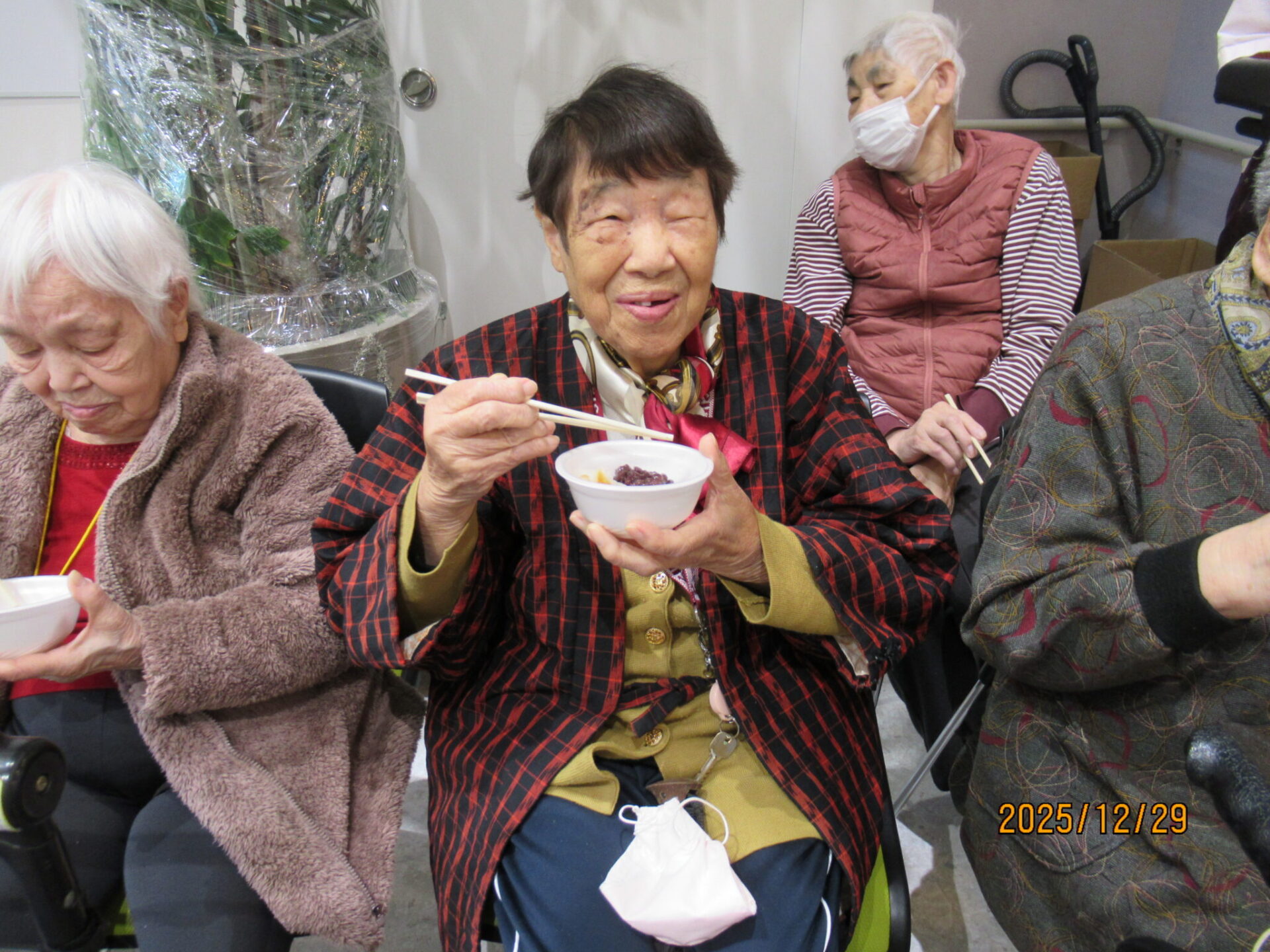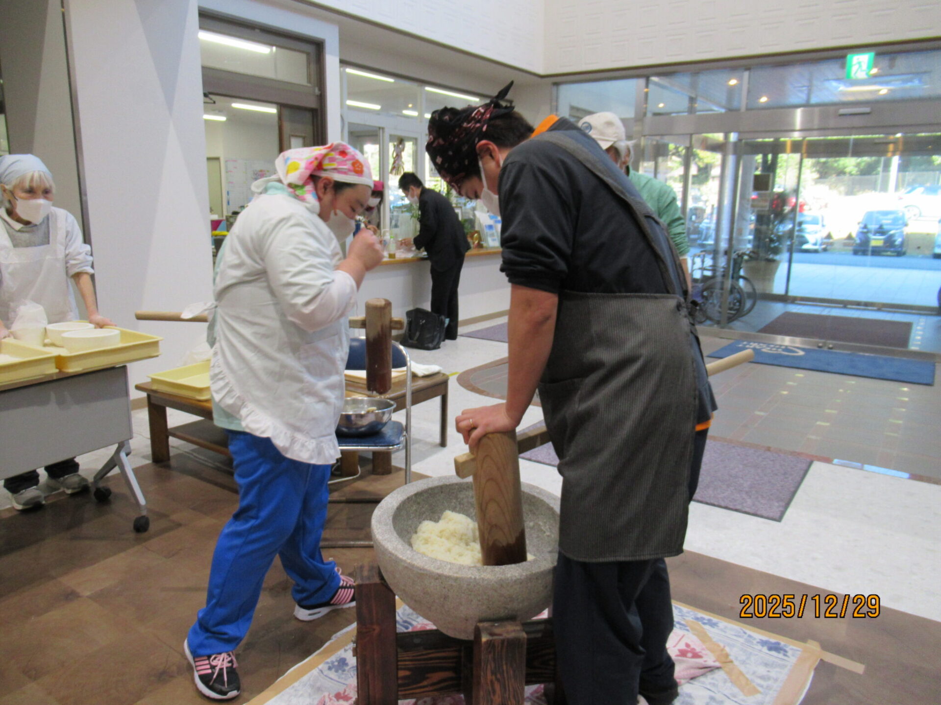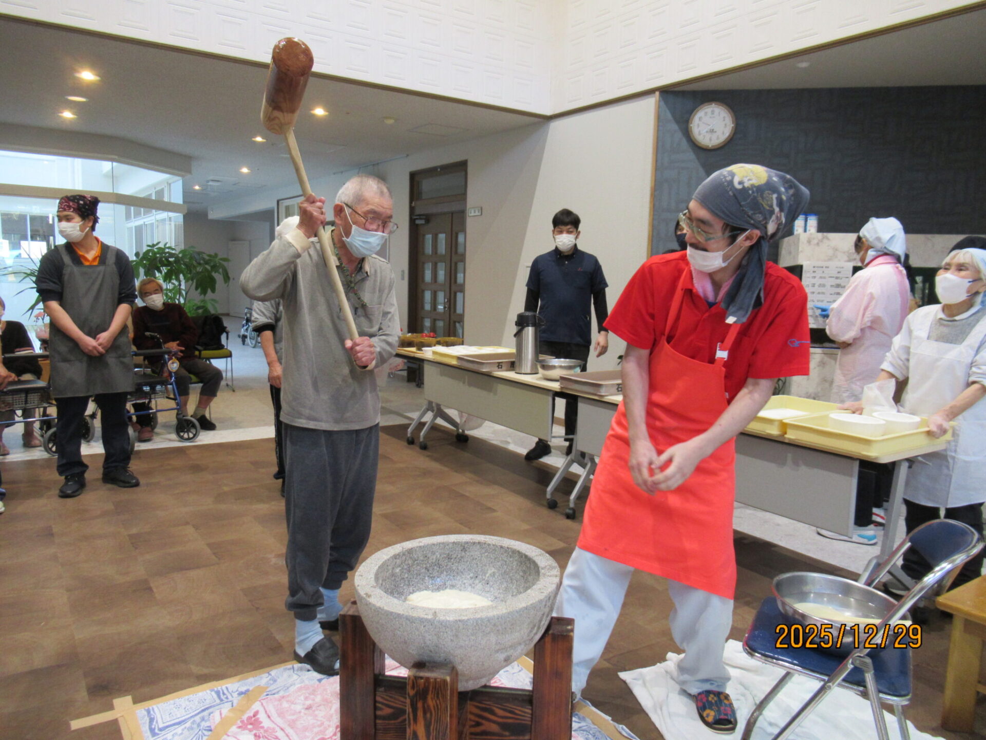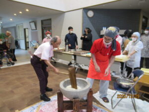 今年も餅つき大会が開催されました。福餅の日、ケアハウスの皆さんも餅つきを楽しんでいました。