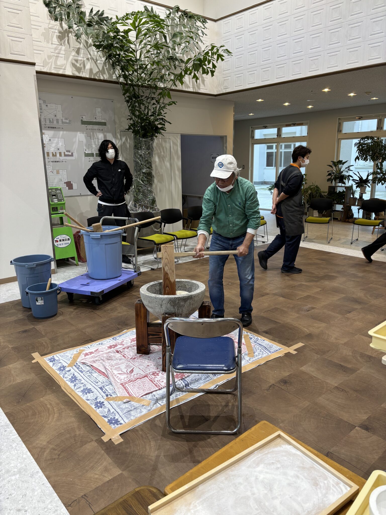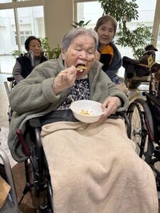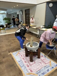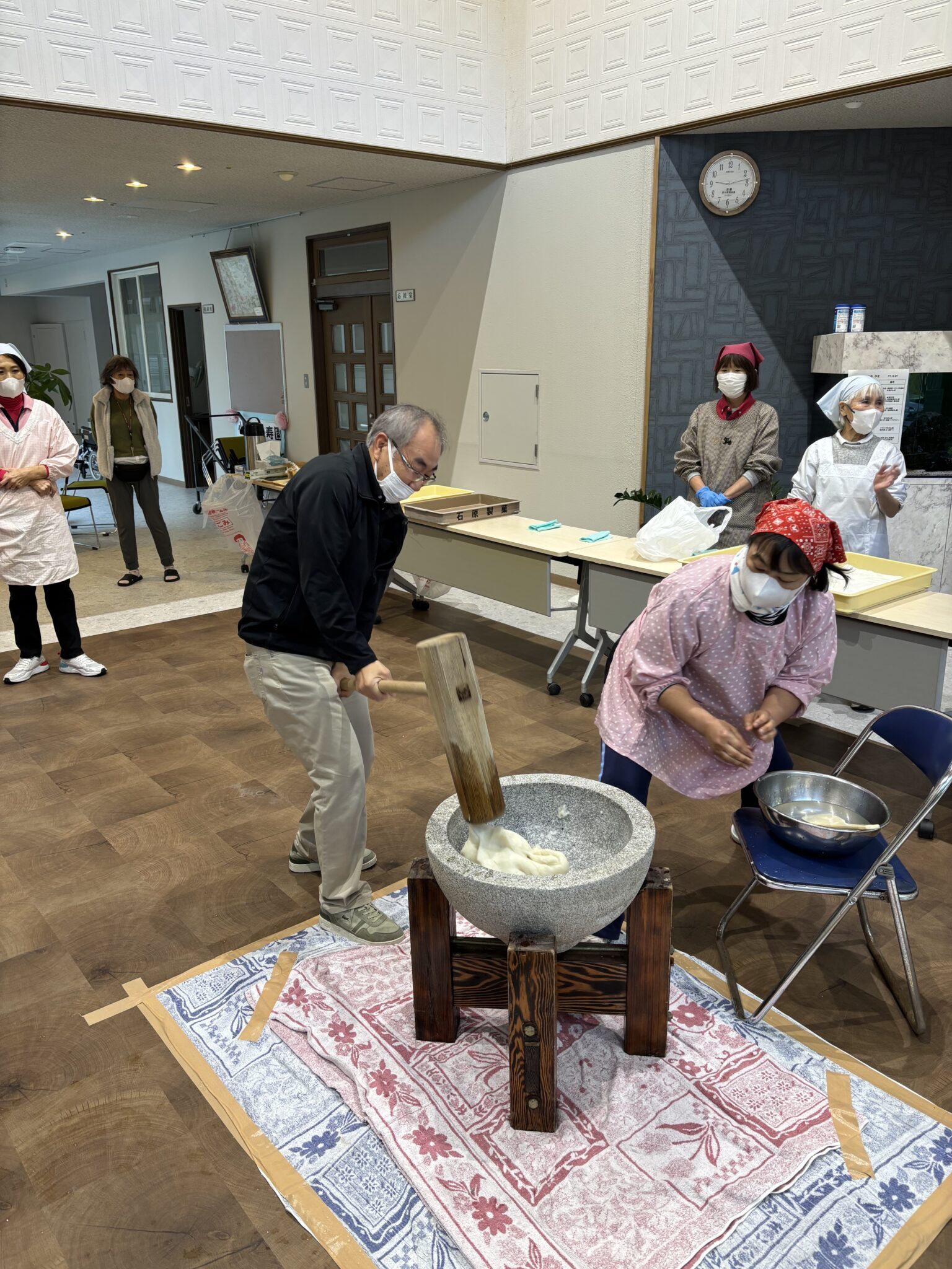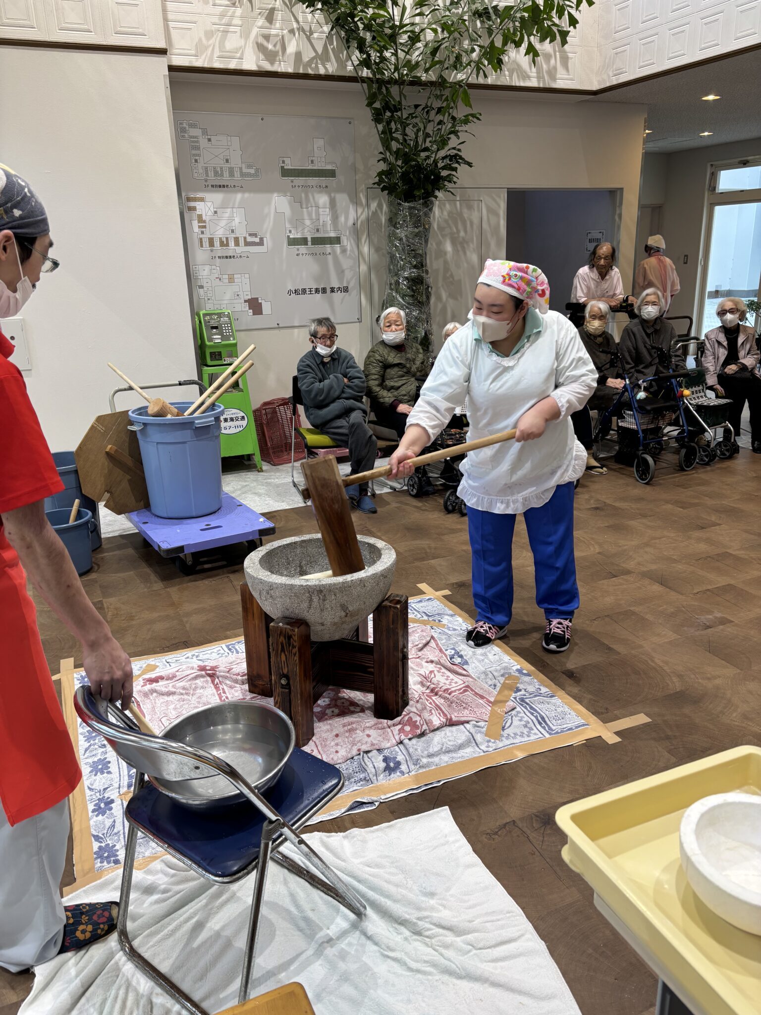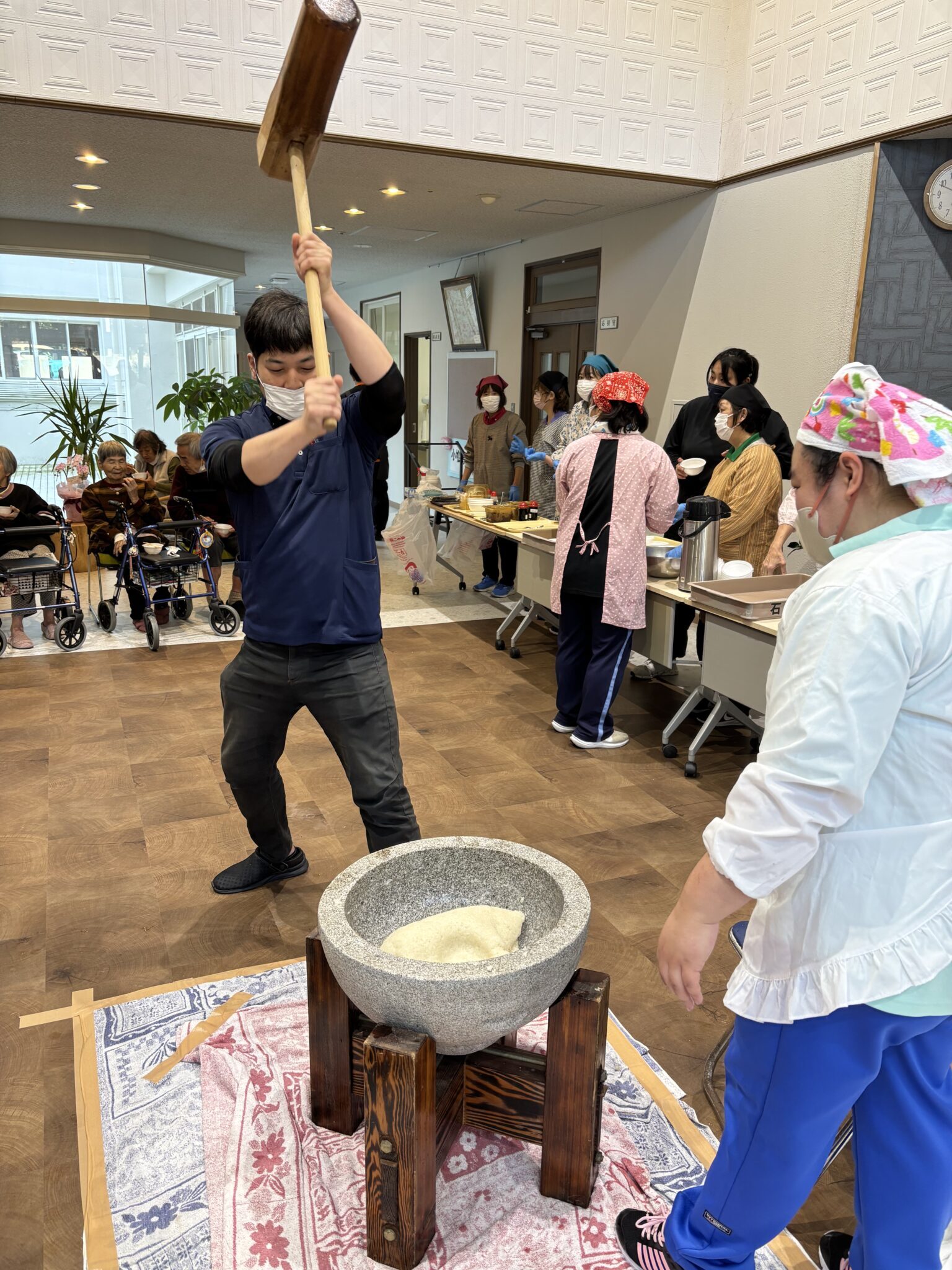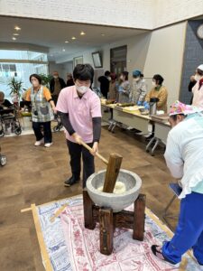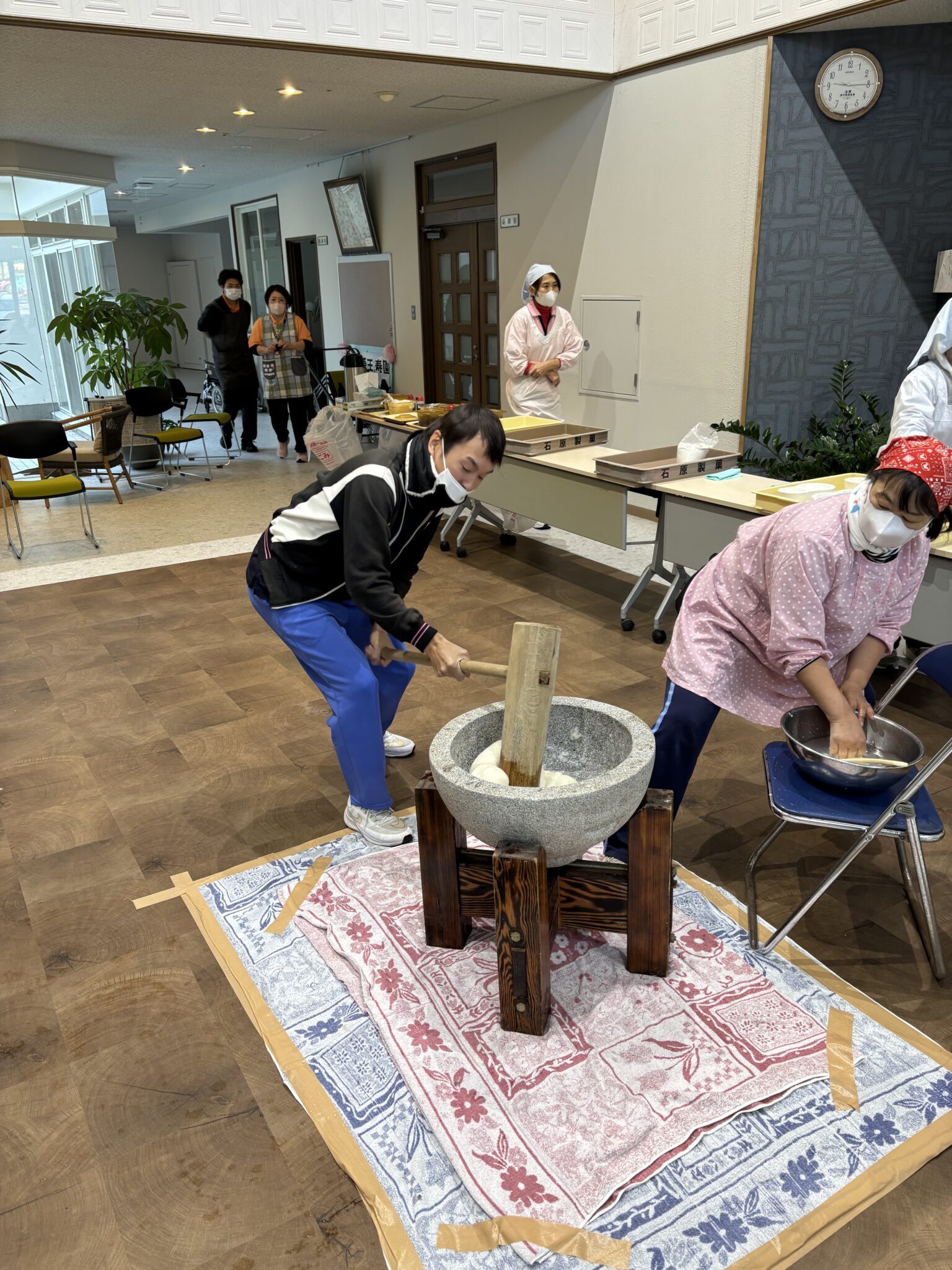 王寿園では毎年恒例の餅つき大会が行われました!(^^)!。昨年は特養でコロナウイルスが流行してしまい、職員のみでお餅をつく形になりましたが、今年は入所者の方も見学に来て下さり、餅を食べて行かれました!!今年は6臼つきました!!