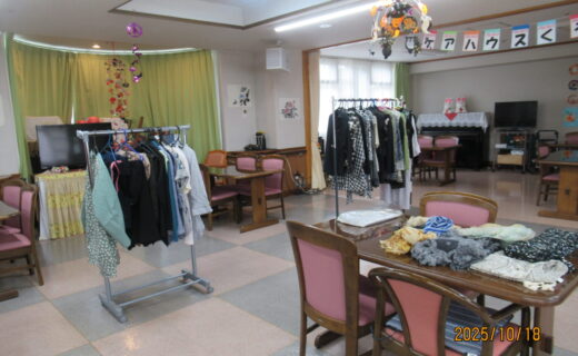 ケアハウスでは久しぶりにバザーを開催しました。どの服がいいか、日用雑...